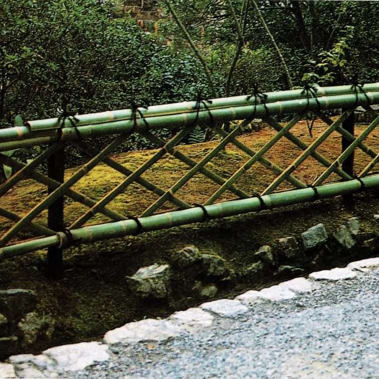 Style ashimoto-gaki, la Ryôanji-gaki se caractérise par une structure diagonale similaire aux yarai-gaki (barrières à claire-voie) mais plus raffinée. Les kumiko (éléments horizontaux ou diagonaux) sont souvent réalisés avec des bambous fendus superposés, et l’ensemble est maintenu par des oshibuchi (éléments plaqués horizontaux) à la base et au sommet.