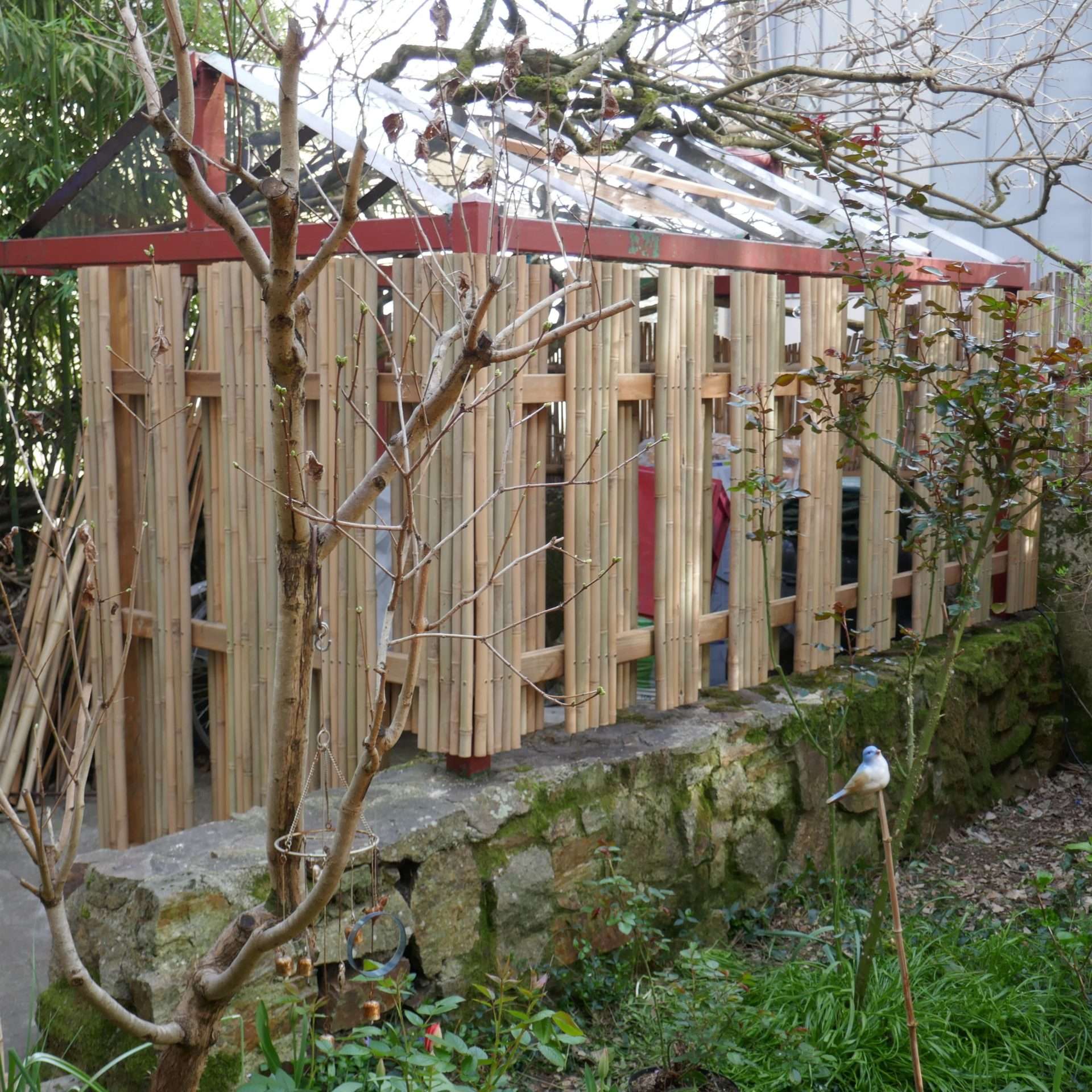 Plus qu’un écran occultant, ce claustra en bois et bambou est un élément architectural à part entière, qui structure l’espace, protège l’intimité et donne une identité forte au jardin.